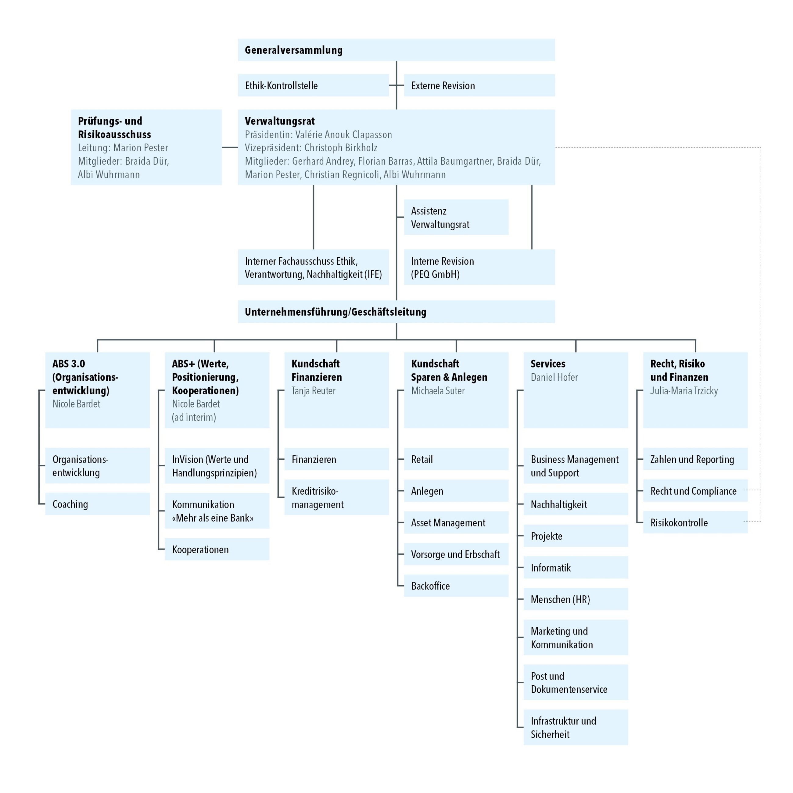 Das Wachstum der ABS in den vergangenen Jahren sowie die zunehmenden regulatorischen Anforderungen machten es auch 2025 notwendig, die Weiterentwicklung des Risikomanagements und der allgemeinen Strukturen und Kompetenzen in der Organisation voranzutreiben. Diese war bereits 2024 gestartet worden. Im vergangenen Jahr wurden die unabhängigen Kontrollfunktionen sowie das Interne Kontrollsystem (IKS) gestärkt und darüber hinaus in Prozesse und Instrumente investiert, um auch bei den höheren Volumina die Risiken jederzeit unter Kontrolle zu haben. Diese Anpassungen spiegeln sich in einigen strukturellen Veränderungen im Organigramm der Bank (siehe auch Punkt 6 auf Seiten 13 und 14).